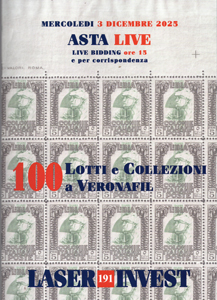 Laser Invest srlvia Londra 12/14, 46047 Porto Mantovano MN, tel. uf. 03.76.39.99.01, fax 03.76.38.57.75, cell. 33.97.95.08.33, www.laserinvest.com. SHOW ROOM a Milano, Galleria Unione 5, tel 02 8412 0035 Asta 191 LIVE e per corrispondenza mercoledì 3 dicembre 2025 ore 15 100 Lotti e Collezioni a Veronafil È questa l’insolita proposta che viene offerta. 100 lotti tutti con la loro stima che hanno generalmente prezzo base 1 euro. Di tutta l’Area italiana, Voli ed Aerostati, Europa, Oltremare, collezioni tematiche. I lotti, previo appuntamento, saranno visibili a Veronafil: perché non andare a vederli? |