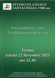 Studio Filatelico Santachiara 1980 sncviale 4 novembre 4, 42121 Reggio Emilia RE, tel. uff. 05.22. 45.59.66, fax 05.22.43.01.46, info@sergiosantachiara.com, www.sergiosantachiara.com. Asta pubblica – Live Vendita Generale n. 293. sabato 22 novembre 2025 a Verona Lo studio Santachiara 1980 ripete il tradizionale appuntamento del sabato pomeriggio alle 15.30 al Best Western Hotel Fiera (ex Ramada). Catalogo di vendita elegante e pratico che presenta 900 lotti tutti fotografati e visibili chiaramente anche sul sito. Un bel assortimento per soddisfare tante richieste collezionistiche e per tutte le tasche, con parecchie rarità e “chicche” che lascio a voi scoprire. Inizia, con i vari settori ed argomenti evidenziati in rosso, con molte interessanti Prefilateliche italiane ed estere, poi Sanità, documenti Militari - Risorgimentali, Vie di Mare e Lacuali, bolli Ferroviari, Diligenze. Poi un po’ di Lotti di francobolli, di lettere e di documenti. Quindi gli Antichi Stati italiani, tutti, ma in particolar modo Lombardo Veneto con annullamenti anche dopo il 1859 su francobolli sardi e dopo il 1866 su francobolli italiani. Poi un po’ di Modena, parecchio Napoli e Provincie Napoletane, un interessante Parma, molto Pontificio (anche Roma 1870) con annullamenti e tante, veramente tante Romagne, anche queste con annullamenti su francobolli sardi ed italiani. Poi molta Sardegna, Sicilia e Toscana tutte annullamenti e belle lettere. Segue il Regno d’Italia con molte lettere e documenti di Vittorio Emanuele II e di Umberto I con tante lettere dirette all’estero e la presenza di diverse affrancature spettacolari e rare. Buono anche Vittorio Emanuele III. Poi parecchia RSI e AMGOT. Quindi Repubblica Italiana. Segue Posta Aerea, Segnatasse, Pubblicitari, Prigionieri di guerra. Quindi le Colonie, Uffici all’Estero, Trieste e qualche Paese europeo. |