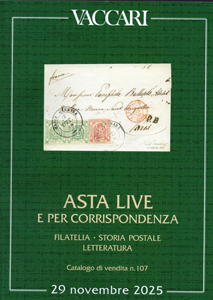 Vaccari srlvia Buonarroti 46, 41058 Vignola MO, tel. uf. 05.97.71.251, 05.97.64.106, fax 05.97.60.157, info@vaccari.it, www.vaccari.it. Asta LIVE e per Corrispondenza - sabato 29 novembre 2025 Catalogo di vendita n. 107 Il catalogo presenta in tutto 1.821 lotti, ed è, come al solito, preciso e ben illustrato e vi è pure un dettagliato indice che aiuta alla rapida ricerca dei vari settori e località. In copertina il lotto 171, base € 75.000, una delle due lettere note “primo giorno” del Governo Provvisorio di Modena in splendide condizioni. Al retro di copertina tanti rari francobolli italiani ed esteri e il lotto 798, base € 4.800, una lettera da S. Sofia con tre francobolli da 1 crazia di Toscana annullati dal raro bollo muto a griglia. L’asta inizia con lettere Prefilateliche e di tutti gli Antichi Stati italiani: Lombardo Veneto con francobolli, lettere e annullamenti, molto Modena con rarità come la lettera di copertina e tanti annullamenti anche su francobolli sardi. Veramente tanto Napoli e Provincie Napoletane con anche una “selezione di annullamenti” delle varie zone: Abruzzi e Molise, Basilicata, Calabria, Campania e Puglia. Interessanti offerte di Parma e numeroso Pontificio con anche un “primo giorno di Ancona” col lotto 454, base € 3.900, un fronte di lettera del 1° gennaio 1852 per Firenze e tanti annullamenti anche di Romagne. Poi Sardegna con tanti francobolli, Sicilia e diversa Toscana con francobolli e lettere. Molti i lotti di Italia Regno, specialmente dell’Ottocento, ma con diverse proposte di tutti i tre Re, anche con lettere con particolari date, combinazioni e destinazioni. Non manca la Repubblica Sociale Italiana, Luogotenenza e Repubblica Italiana (anche una quartina del Gronchi Rosa). Uffici Italiani all’Estero, Colonie e Occupazioni, una bella collezione di francobolli di Fiume, Via di mare, Interi postali, San Marino, Vaticano ed il settore Estero con Francia e Gran Bretagna in particolare. Vi sono poi quasi 300 lotti di Lotti, collezioni e curiosità con album e scatoloni di francobolli, di lettere e di interi postali dove trovare offerte veramente convenienti. Come per i più di 130 lotti di Letteratura filatelica, una “specialità Vaccari” a tutti nota che chiude l’asta con l’offerta della collezione completa dei 68 numeri di Vaccari Magazine. Da rilevare che da Vaccari i prezzi sono comprensivi delle commissioni. |